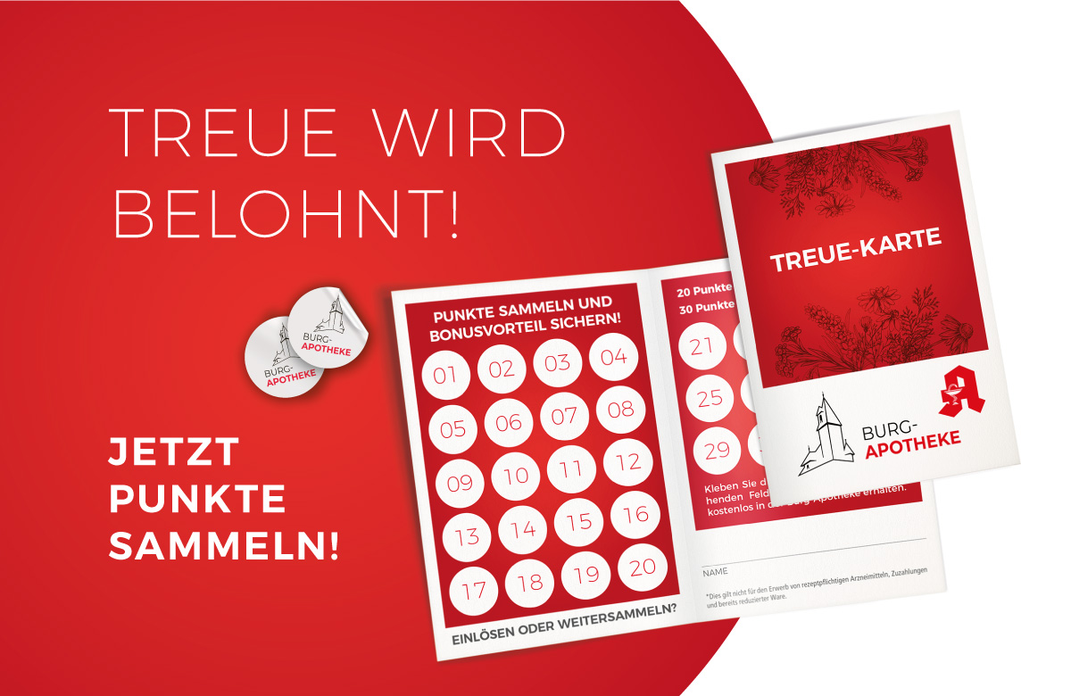 Sammeln Sie Burg-Bonus-Punkte bei Ihren Einkäufen* in Ihrer Burg-Apotheke in Kempten. Pro 10 € Einkaufswert* erhalten Sie 1 Burg-Bonus-Punkt. Kleben Sie die erhaltenen Punkte auf die Rückseite der Burg-Bonus-Karte auf, die Sie kostenlos in der Apotheke erhalten.